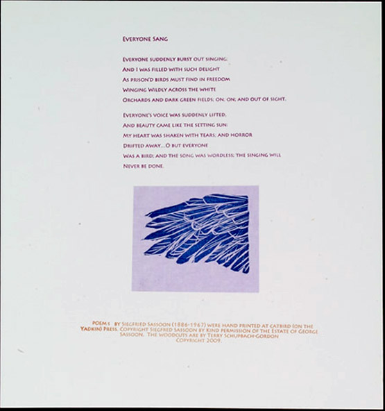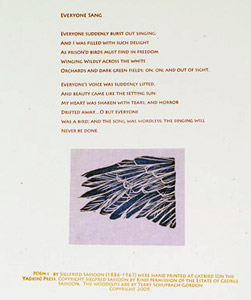 Terry Schupbach-Gordon: "Siegfried Sassoon (1886 - 1967) is best known as a poet of World War One. He wrote this poem in celebration of the armistice, just before he learned of the death of his friend, Wilfred Owen. This [broadside] was made in hopes that the beauty of these words will, like the singing, 'never be done.'"