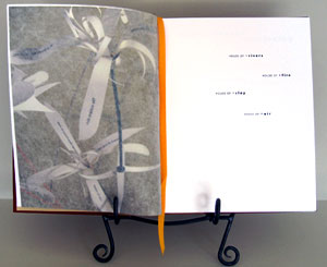 9.25” x 7.25”; 36 pages. Type is Cairo. Japanese calligraphy by Mitzuko Santo. Printed on a 10 x 15” Chandler & Price platen press. Silk screen images. Text paper is Japanese Toyo Kurumi. Cover is Arches. Overlay are UV Ultra II. Tip sheets are Okawara Hand made. Press check masks are printed on Mohawk superfine cover. Two texts: reading from front to middle: second reading from back to middle. Japanese stab binding. Signed and numbered by Anderson.
