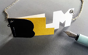 Irene Chan: "'Black Lives Matter Paper Necklace' is hand cut paper and is both a pendant and a book. You can write or draw behind the letters (hidden) or on the letters that will be seen and become part of the pendant. A metal chain and clasp included. The BLM is in black, yellow, and white."