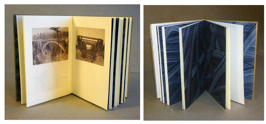 3.25 x 5.25"; 3 pages. Indigo pigment pastepapers. Sources: Photographs of the Catskill water supply system in process of construction, 1918, with A topographical map of Hudsons [sic] River, Claude Sauthier, 1898, both from The New York Public Library Digital Collections. Printed onto Asuka paper with an Indigo printer. Full cloth binding, stamped paper label.