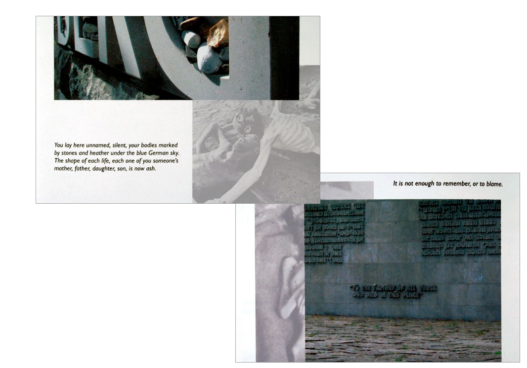 "The second section is about Mittelbau-Dora, a camp in central Germany. Prisoners were forced to labor here in an elaborate underground tunnel complex, constructing V2 rockets for the German Army. They lived in the tunnels, where conditions were so bad that the average life expectancy was 4 to 6 weeks. The camp was liberated in 1945 by American troops, who bombed closed the tunnel complex and destroyed most of the other buildings. Parts of the tunnel are now open, but a decision was made not to restore it, rather to leave it in the condition in which it was found on reopening. Few other structures remain, except a crematorium used for disposing of the dead, which is one of the few buildings to have been restored. Again I looked for the presence of individuals in this empty place, and the text is a list of prisoners' names that runs continuously behind the pictures, a kind of lament for those who are gone. I also deliberately cropped and placed images into the gutter to express loss and the anonymity of those whose names we do not know.