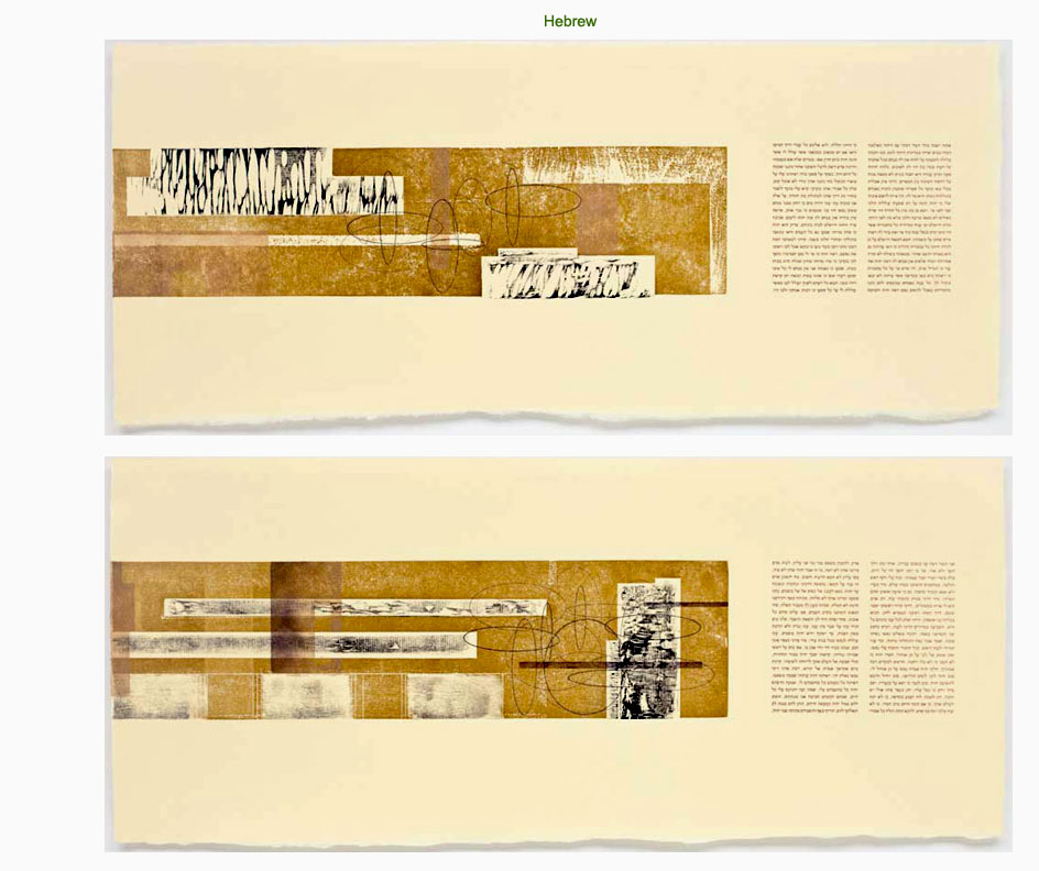 12 x 6";28 pages. Simple accordion flag structure with double flag pages interspersed. Letterpress printed on Shin Torinoko Cream paper from photopolymer plates. Printed with Silentium Pro and David types and Hebrew wood type. Illustrations of color lithography created from brush drawings. Housed in a wrapper of Kyosei-shi paper over boards with a laced vellum closure. Text printed in Hebrew and English.