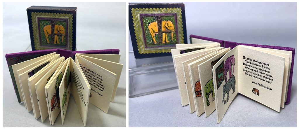 Letterpress edition: 1.5 x 1.5" accordion-fold flutter book. Bound cloth with patterned end-papers. Card slipcase with image of elephant on front. Laid in clear acrylic snap case. Book art, design, and hand-colored illustrations by Carol Schwartzott. Numbered and signed by the artist. These are artist proof copies.