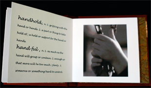 Ginger Burrell: "The sepia-toned photographs create a warm tapestry of hands at work, at play, and in interaction. By focusing solely on the hands, the images capture emotion as expressed in body language. Each photograph has a unique story reflected in definitions of hand-related words."