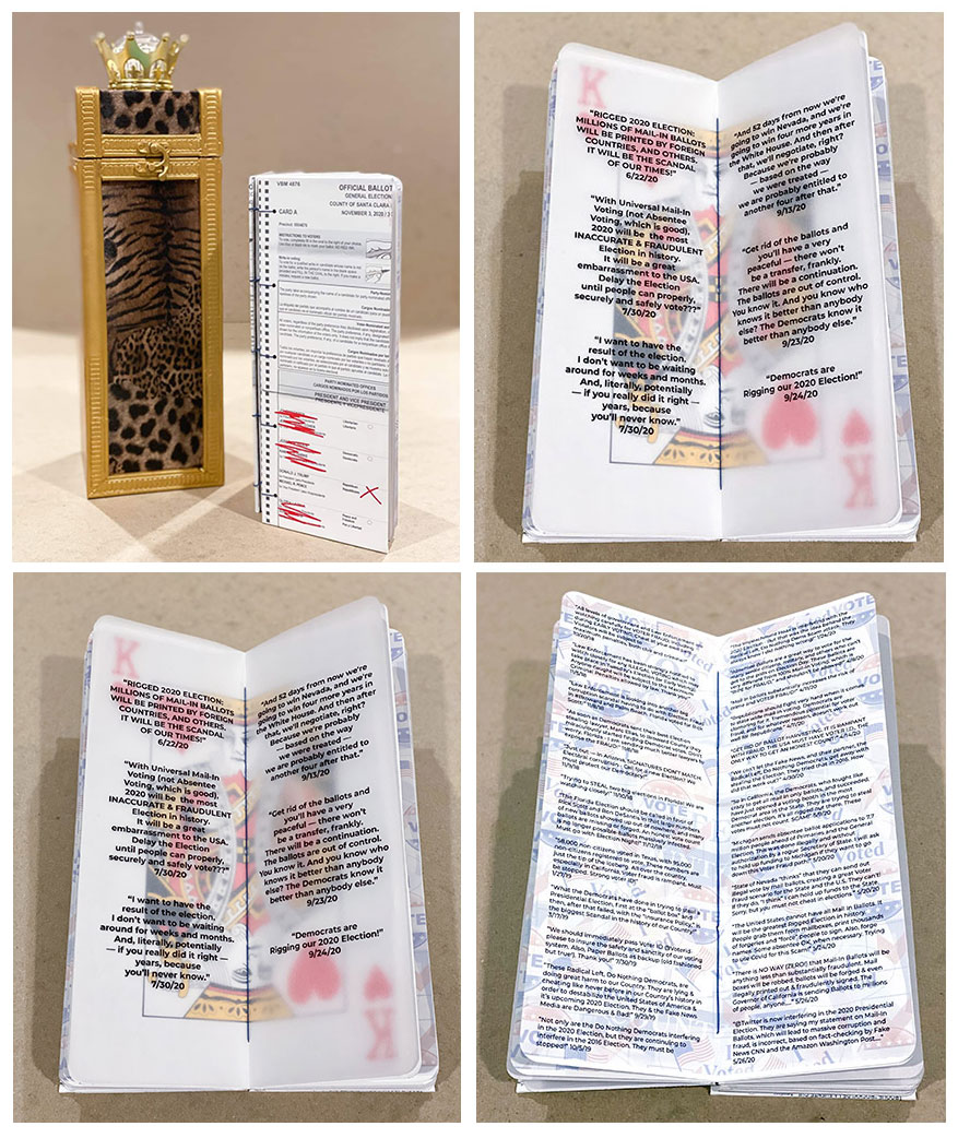 Presented in a custom wooden "ballot" box with gold and animal print design. Features a crown with "rigged ballots" on the box. Inside is a coptic-bound book (44 pages) with ballot cover, king and joker playing cards, vellum and Epson Premium Presentation Paper pages. Archival inkjet printing.
