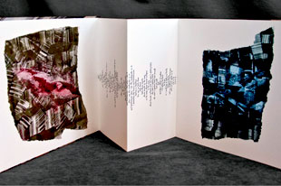 "The finished book is multi-layered with original poetry printed on cotton patterned fabric, pages made of layered pattern paper, and pages of the original book."