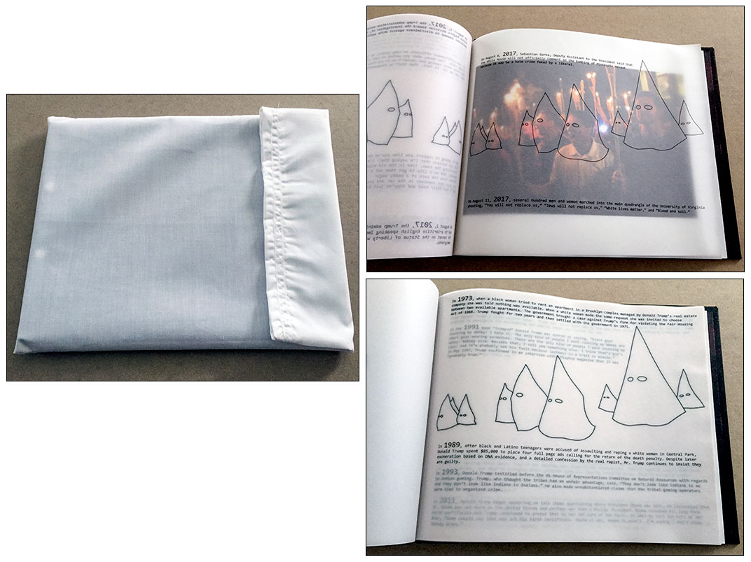 8.75 x 11.5"; 23 leaves + front flyleaf. Printed on white vellum and Epson Premium Presentation paper with laser toner and archival inkjet. The font is Consolas. Bound in quarter cloth hard cover with screw post binding. Presented in a white sheet case. Signed and numbered by the artist. The photograph "White Supremacists March with Torches in Charlottesville" is used with permission and by licensing agreement of Getting Images/Anadolu Agency.