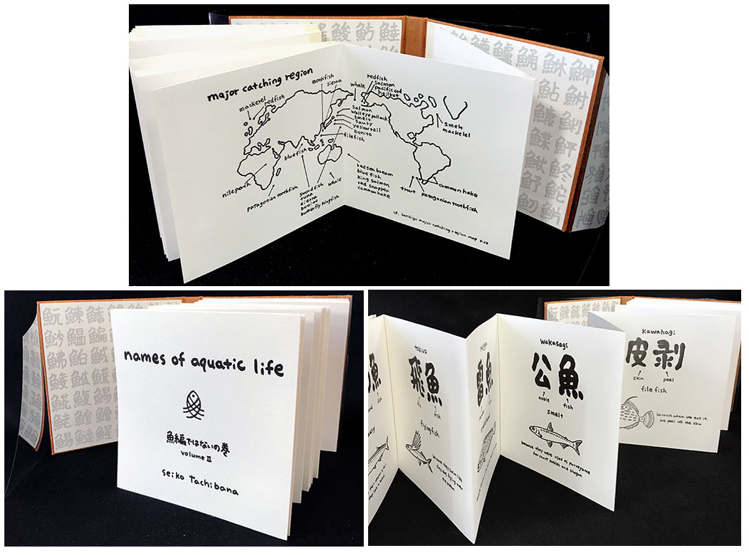 Seiko Tachibana, Colophon: "There are about 555 characters for names of aquatic life made with the character 'fish' in one letter. I chose 35 of these for volume I. For volume II, I have chosen 27 characters for the names of aquatic life that are not one letter. Volume I was inspired by the unique way the names of aquatic life are written. Volume II was inspired by volume I. I noticed that there are meaningful exceptions in names that are not one character."