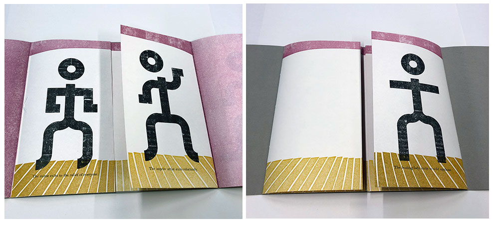 12 x 6"; 36 full pages, 5 semicircle pages. Printed letterpress on Text Wove paper using handset type, polymer plates from Boxcar Press. Pressure printing, collage, and paper engineering. Bound with covers of Grey Rives BFK Heavyweight using a packed single needle link stitch and linen thread. Encased in a cloth-covered clamshell box. Begun in 2016 and fully completed in early 2019. Signed and numbered by the artist.