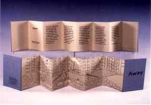 "This carousel book uses a format that I devised to allow for scenes and separate text panels. The spine tabbing, also of my devising, functions both to hold the book together and to balance the thickness at the fore-edge."