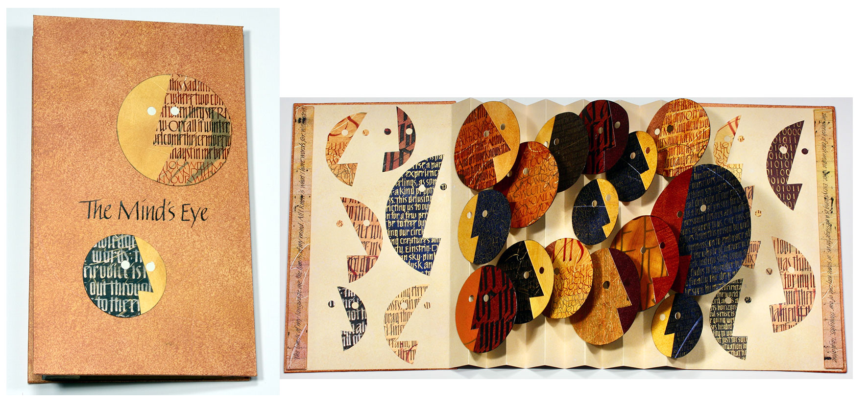 10 x 19 x 4 inches open, 20 x 6 x .75 inches closed. Hand lettered with acrylic and ink on paste painted paper. Paper case. Signed and numbered by the artist.