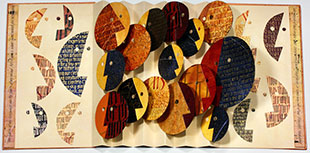 13 x 9.5 inches closed, 13 x 19 inches open; 20 pages. Codex structure. Acrylic, sumi and walnut inks on Katie MacGregor handmade paper and colored polyester. Text from 1 Samuel with layered writing of 'Hannah's song in early Semitic, Greek, Latin and binary translations. Early music notation. Paper cover. Laid in drop spine case with ribbon closure. Signed and dated by the artist.