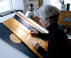 Jan Owen: “I was born in New York City, grew up in Hastings-on-Hudson, New York and loved to draw and read as a child. Now I live in Belfast on the coast of Maine with long winters to write and beautiful summers. I walk to the beach to watch the sun rise and the tide come in. My day begins with brushstrokes to music, on to lettering and then to the words. “My first books were long, hanging accordion fold books, large pieces that could be seen all at once and then folded away. I played string bass with a symphony orchestra for many years and the music always kept moving forward. I wanted my art to be still and include brush strokes and layers of words all visible at once. Amanda Degener of Cave Paper gave me a large, already bound book of her walnut paper which forced me to think about progression and it became Requiem. Now I like planning the pacing and arrangement of pages, words and images. “ |
