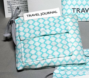 "The sixteen panels are packed in a cotton pouch made of cloth suggesting a hospital gown. The snapped breast pocket accommodates tools for the reader to use in completion of the project, including: needles and thread, colored pencils and a sharpener, a small hand-carved stamp, stamp pads, two sheets of custom-made stickers, a custom-made plastic drawing template, and a small, saddle-stitched journal. The pouch readily holds the 16 panels before and after binding."
