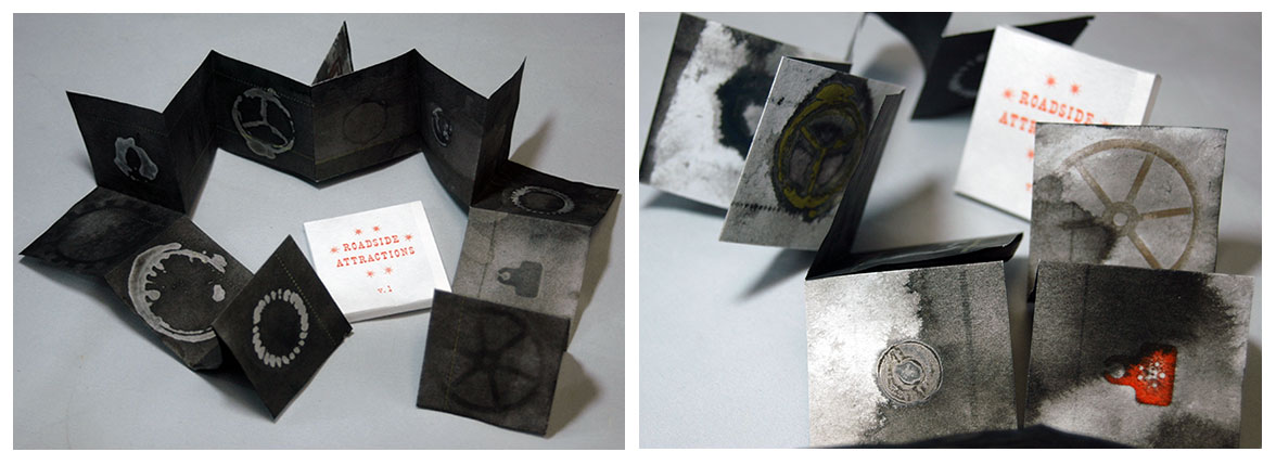 Marnie Powers-Torrey: "Roadside Attractions documents collected evidence, inviting the reader to draw individual conclusions on the quasi-environmental study conducted by the artist. The small boustrophedon forms take notice of the intricacy of waste that proliferates at America's roadsides. Each book is a grid of micro-meditations that attempt to balance human being's misuse of resources with our incredible ingenuity and progress. The prints document tiny indicators of how we thrive and falter —each micro page a critical piece of an unknown something. The books' structure invites the viewer to map these discarded pieces without promise of arrival at a final destination. Simultaneously, the viewer is engaged in hypothesizing about the broken objects' former uses. ... The deluxe set travels in a box that opens like the back of a caravan wagon, taking goods and entertainment on the road."