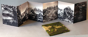 6.75 x 5.25 x 2" closed, opens to 6.75 x 9.5 x 9.5"; 5 double-page spreads. Handset type, photopolymer plates, watercolor, and inkjet on Rives BFK, Canson Mi-Tientes, and Enhanced Matte paper. Printed on the Vandercook SP20 at Kala Art Institute. Handcut and bound in carousel format. Slipcased. Signed and numbered by the artist.