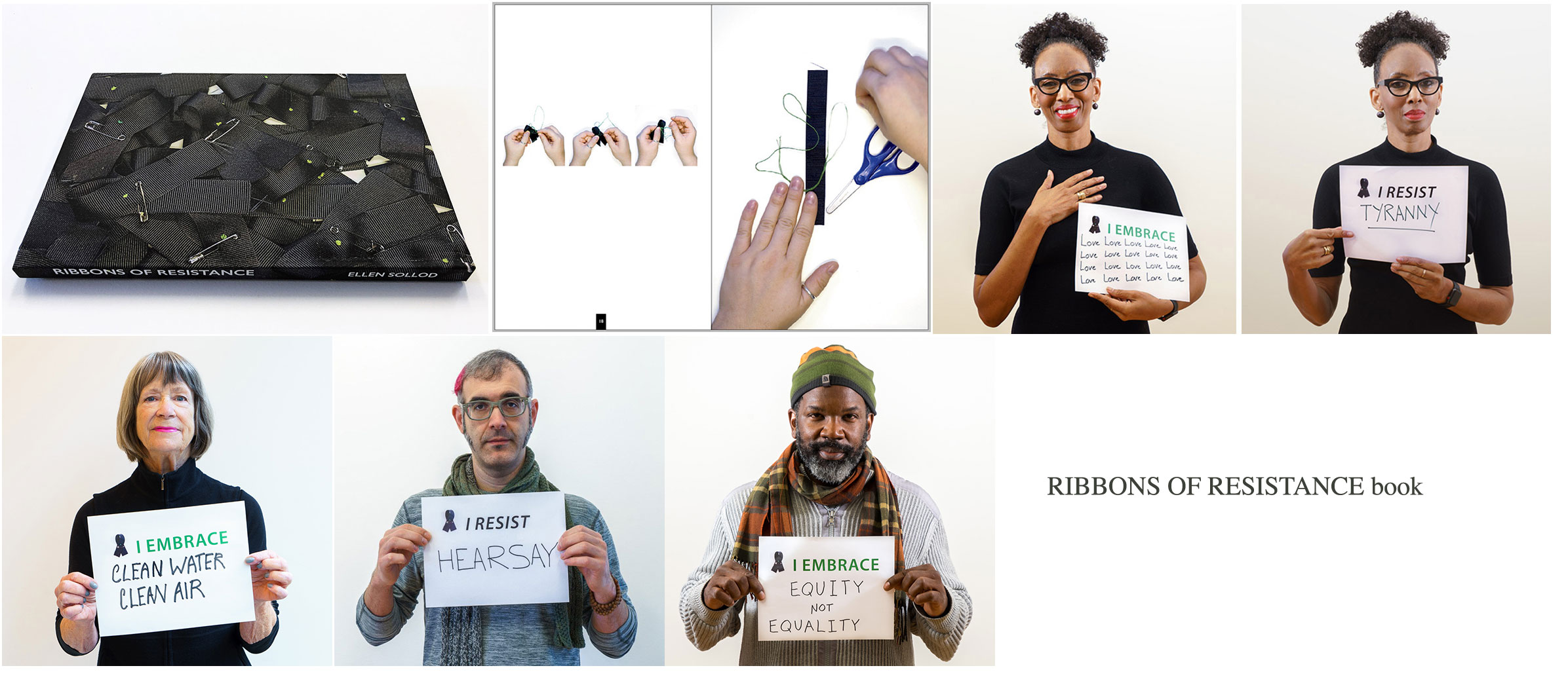 Ellen Sollod: "'Ribbons of Resistance' chronicles the artist's project making and distributing 1500 embroidered ribbons at marches and demonstrations through 2017, including the Women's March, Science March, Immigration March and Tax March. It also features her 'I Resist/I Embrace' portrait project. '100 Days/100 Postcards' includes facsimiles of the postcards the artist sent to the White House during the first one hundred days of the Trump Administration."