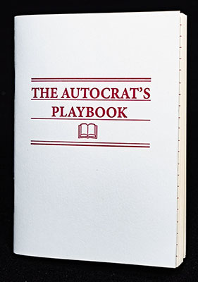 The Autocrat’s Playbook concisely describes the steps autocrats traditionally take to achieve their dictatorial aims. It was a call to action in response to the very real jeopardy that the U.S. democracy faces under the Trump Administration. The pocket-sized pamphlet references both a coach’s football play book and a pocket Constitution. The Autocrat’s Playing Card tucked in the back references both the Joker in a common deck of cards as well as the collecting of both football and baseball cards.