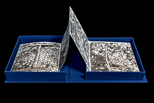 Ellen Sollod: "This nontraditional artist book was inspired by the research of Steve Warren and Von Walden who photographed ice crystals through a microscope over a three-month period in the early 1990s. Professor Steven Neshyba at the University of Puget Sound (UPS) introduced me to their work while we were working on a collaborative project for the “Science Stories” exhibition at Collins Library. I was immediately fascinated by the beauty and mystery of these source images and, with the scientists’ permission, endeavored to translate them to cyanotypes. I chose this medium because of its ephemeral nature which seemed in keeping with the depiction of such fleeting elements as ice crystals.