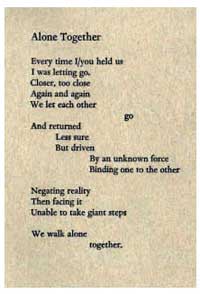 Alone Together is a collection of 19 poems spanning 30 years. The limited edition of 50 was letterpress-printed on handmade cotton rag paper in Dante type, with two pochoir illustrations [38pp, 13.5 x 22 cm]. The binding is a quarter-cloth case using silk cloth and cotton rag and includes silkscreened endsheets. All work done by SpeakEasy Press.