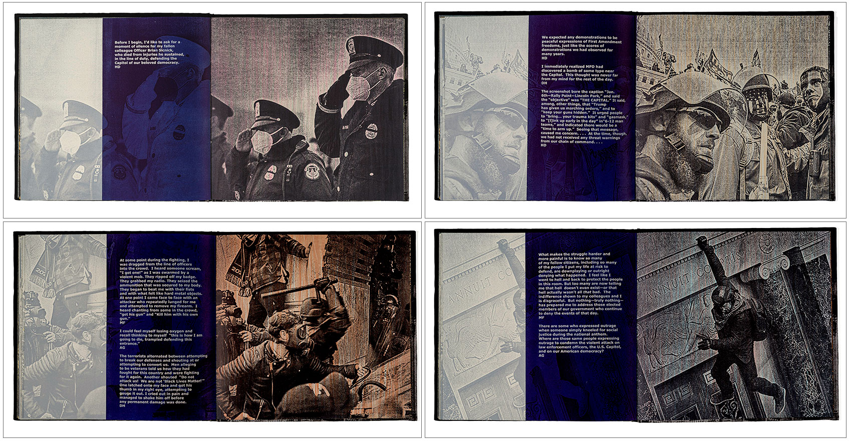 Fred Hagstrom: "’The Blue and the Red’ uses archival photographs from the January 6th attack on the capitol, coupled with comments by the Capitol Police, convicted rioters and politicians who spoke in support of the attack. Much of the text comes from congressional or court testimony, while the quotes from politicians come from media sources."