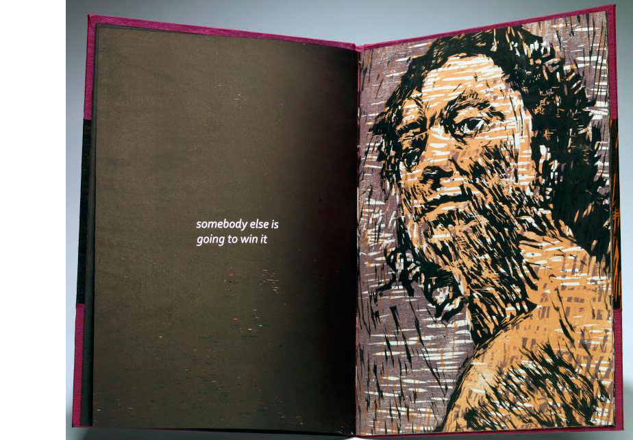 19 x 13"; 34 pages. Printed in relief from laser cut woodblocks. Silkscreen cover. Drum leaf binding. Signed and numbered by the artist.