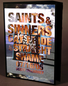 fundamentalist protesters at Rochester New York's 2005 Gay Pride parade. Images of the parade, files downloaded from the internet and a biblical text are fused using 'invert' and 'difference' blending modes in Photoshop."